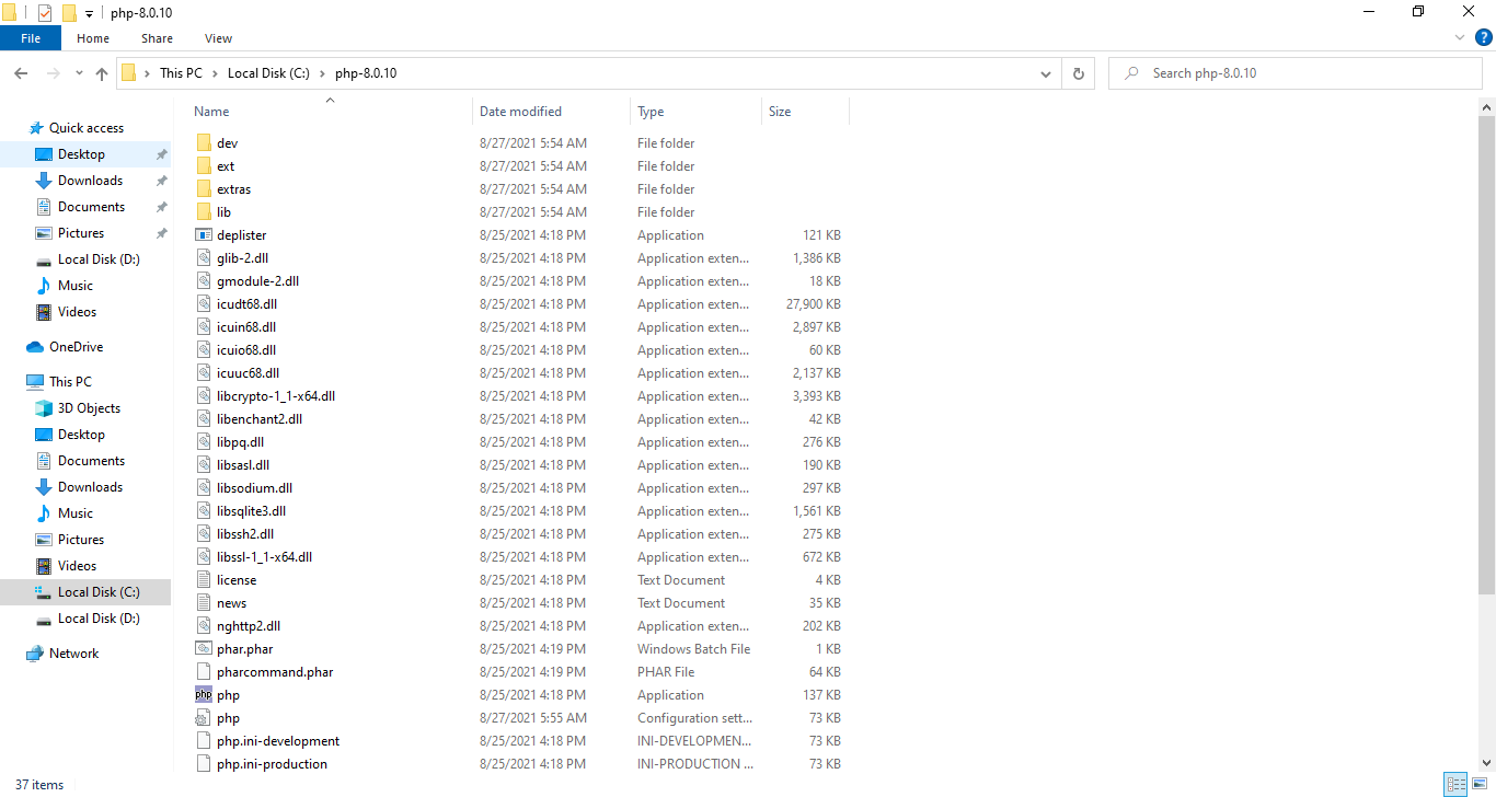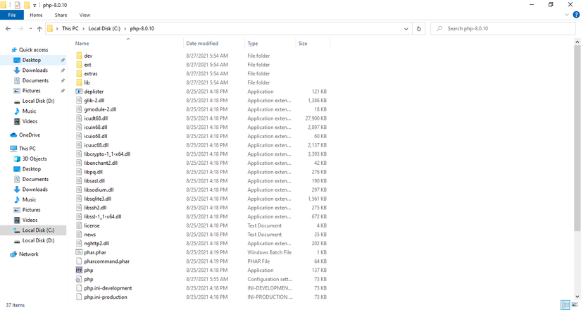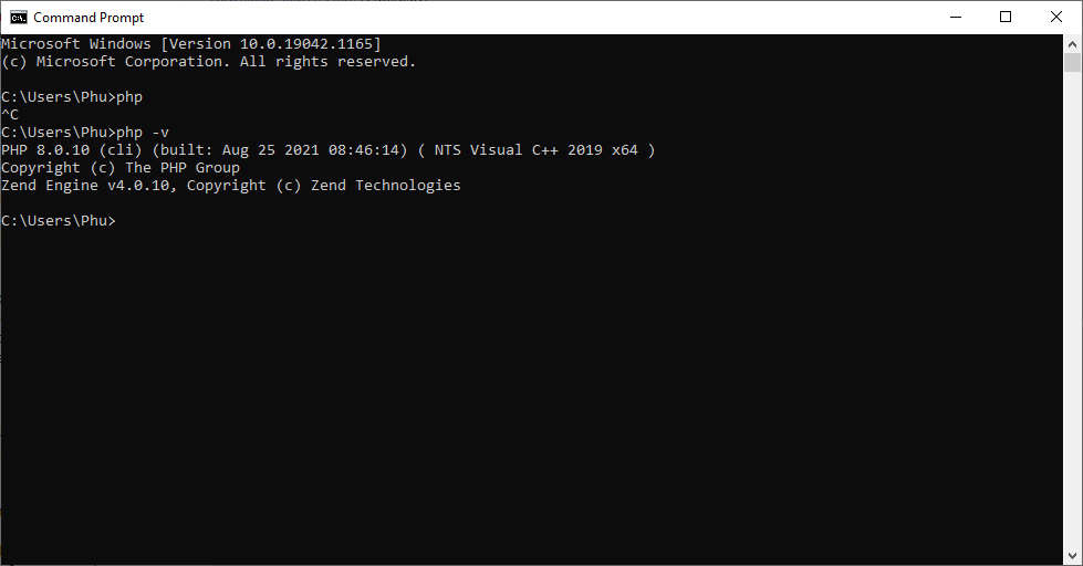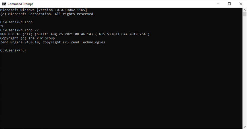 Như vậy là chúng ta set env xong cho PHP. Để chắc chắn, chúng ta cần phải test. Đầu tiên, mở command prompt lên, sau đó gõ lệnh php -v nếu kết quả ra gần giống như hình (có thể version khác nhưng phải là version 8 đổ lên) thì bạn đã cài và set env thành công PHP:
