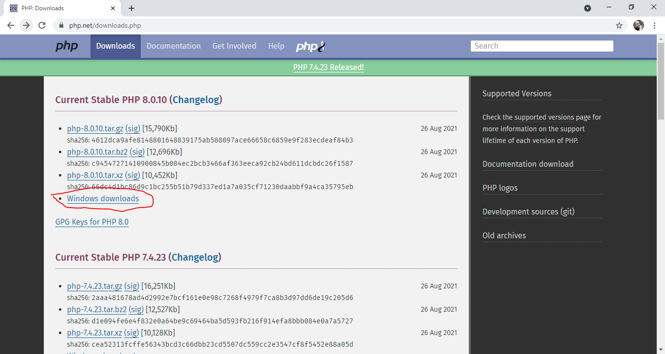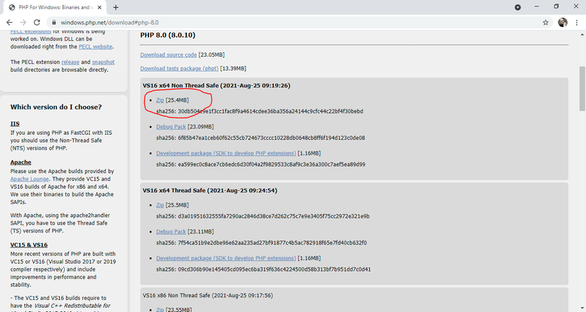 Các bạn truy cập vào url https://www.php.net/downloads.php và chọn Windows download như hình: