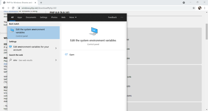 Tiếp theo đó, chúng ta cần set environment để có thể chạy lệnh PHP trong command prompt. Các bạn mở Start Menu và gõ env, sau đó chọn như hình: