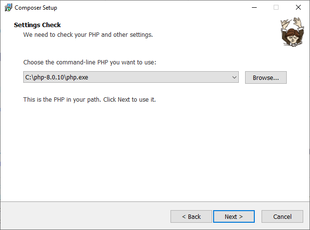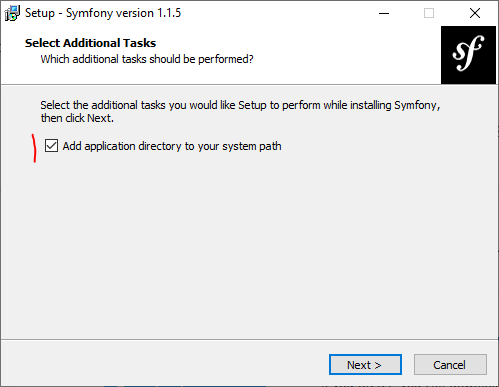 Sau khi tải xong, các bạn mở trình cài đặt. Ở bước 1 chúng ta lưu ý là bạn nên tích vào ô checkbox để không cần phải set env thủ công cho Symfony CLI: