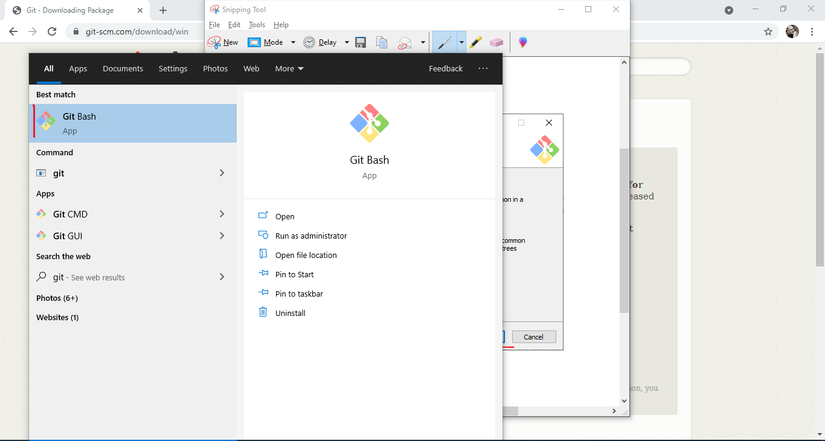 Sau khi cài xong, để chắc chắn là git đã được cài trên máy, các bạn gõ lệnh git trong Command Prompt hoặc Git Bash. Lưu ý, để mở git bash, các bạn vào Start Menu, tìm git và chọn git bash như hình: