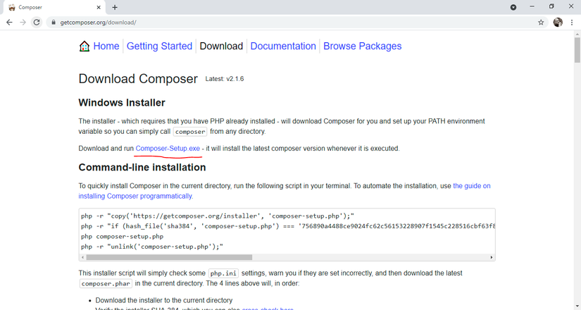 Để cài đặt composer, các bạn truy cập vào url https://getcomposer.org/download/ và chọn Window Installer để tải trình cài đặt Composer cho Windows về máy: