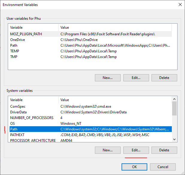 Sau đó các bạn chọn PATH ở trong System variables và chọn Edit: