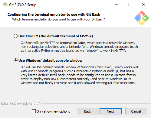 Ở bước 9, nếu các bạn thích dùng Command Prompt thì chọn như mình, nếu các bạn muốn dùng MinTty thì chọn option 1 và bấm next: