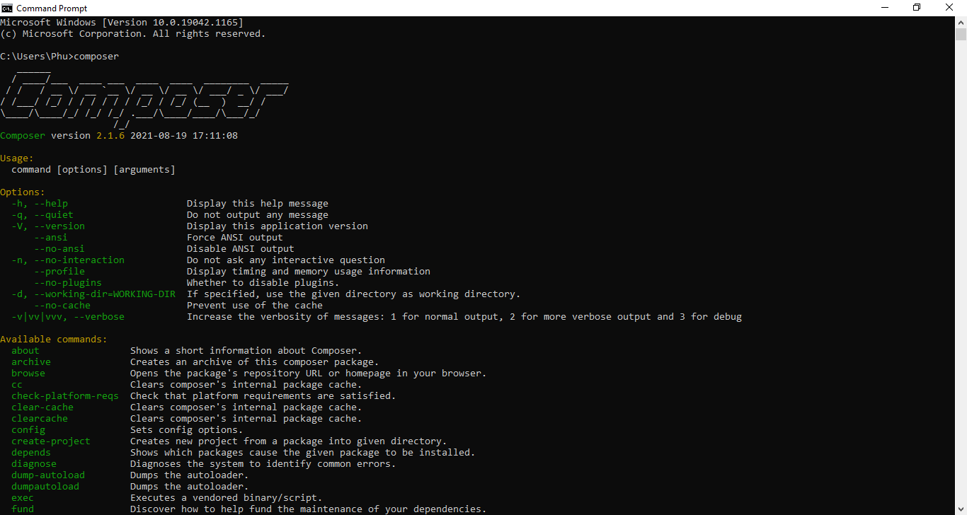 Để chắc chắn chúng ta đã cài thành công composer thì chúng ta sẽ test bằng cách mở Command prompt và gõ lệnh composer nếu kết quả gần giống như hình thì bạn đã cài thành công: