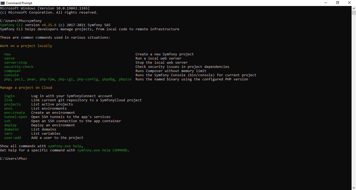 Sau khi cài đặt xong, để kiểm tra xem symfony CLI đã được cài trên máy chưa, các bạn mở command prompt và gõ symfony. Nếu kết quả gần giống như hình thì bạn đã cài đặt thành công Symfony CLI trên máy: