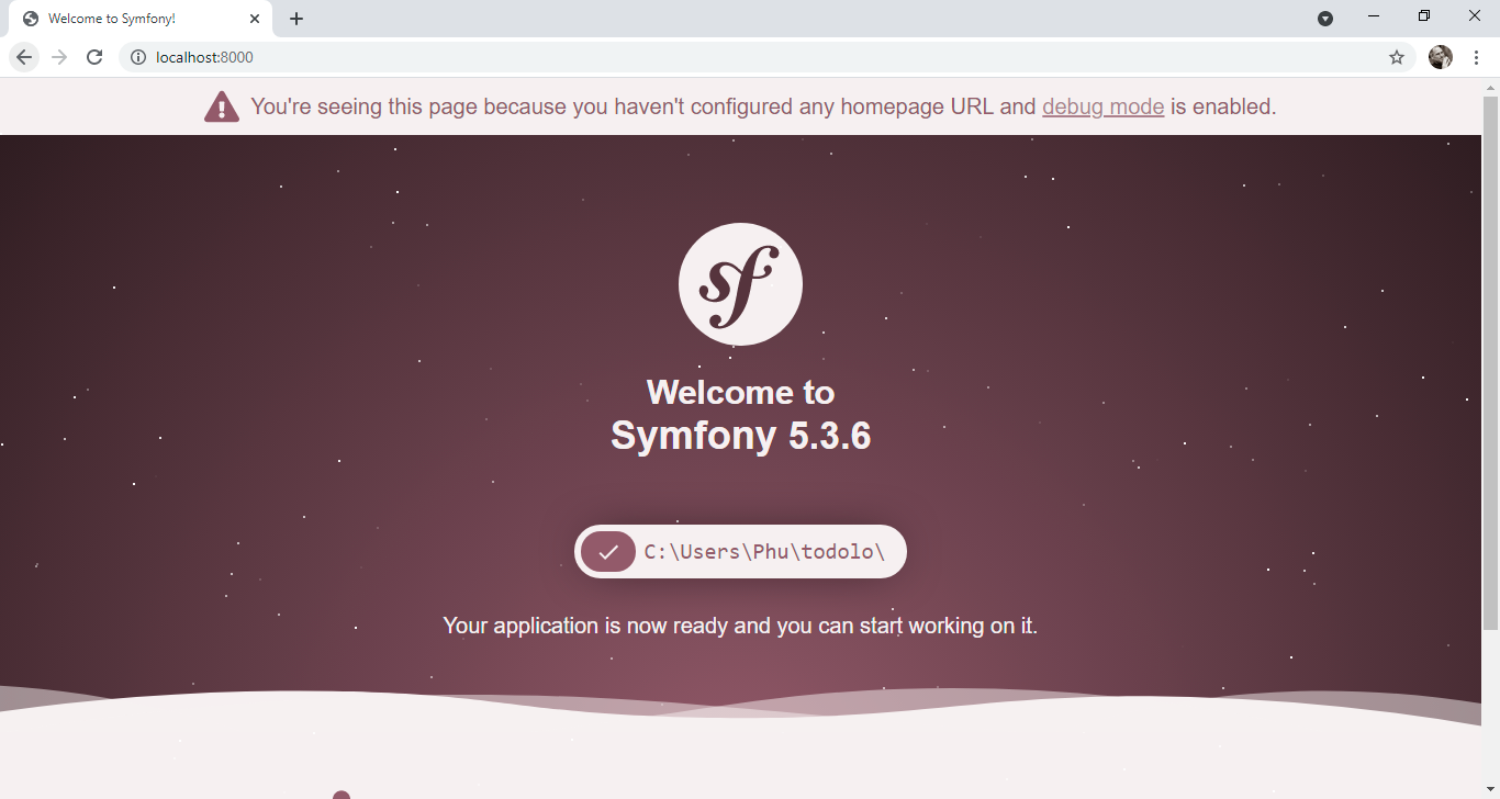 Vì vậy, các bạn sẽ mở Browser lên và truy cập vào localhost:8000, nếu các bạn thấy giống hình này thì chúc mừng các bạn đã chạy thành công dự án viết bằng Symfony: