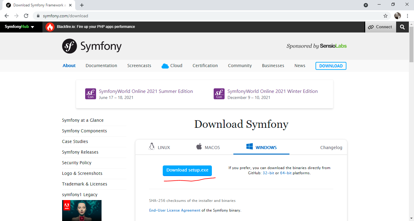 Các bạn truy cập url https://symfony.com/download và chọn tab Windows và click chọn Download như hình:
