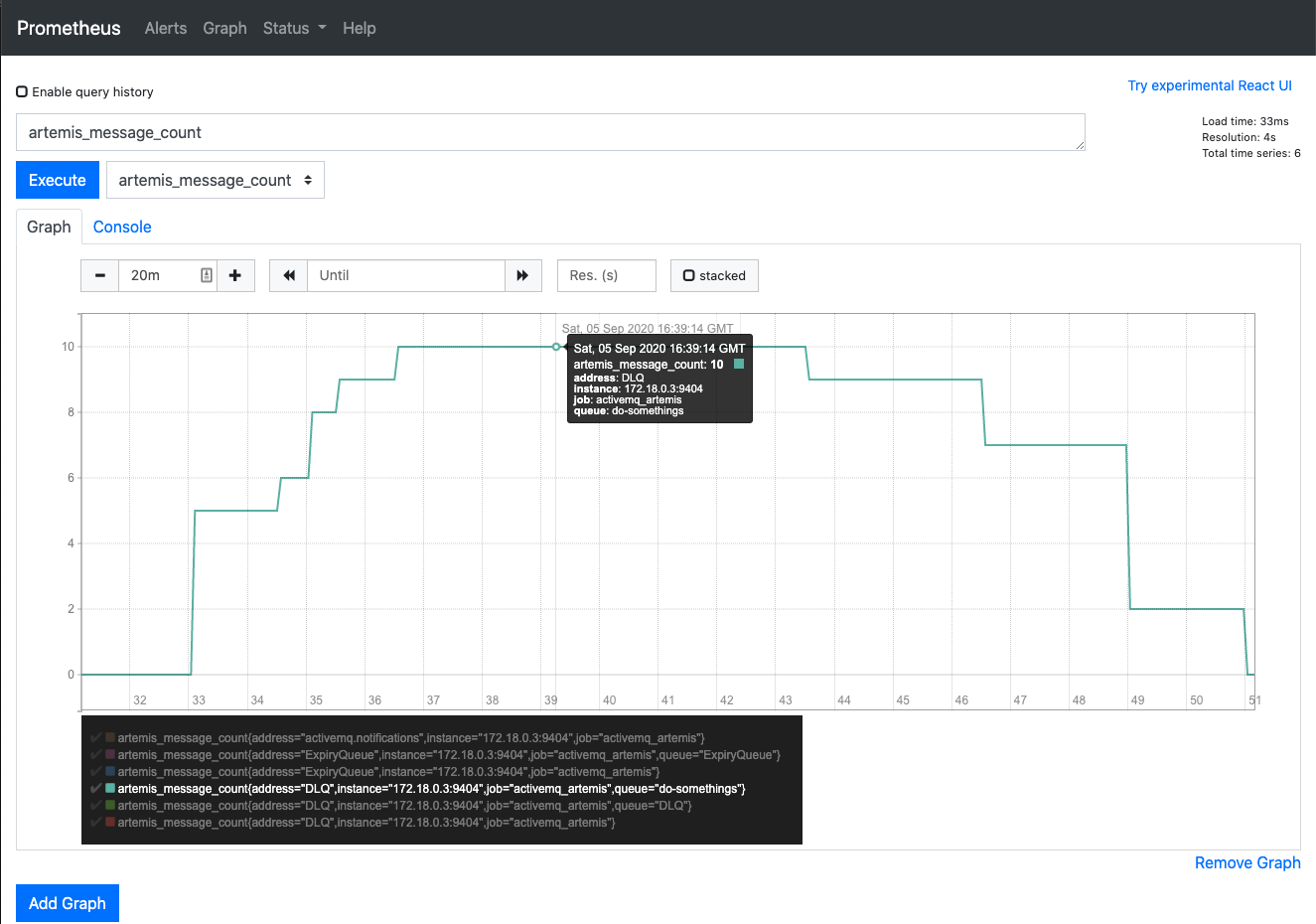 Hiện tại với 1 server Prometheus nó sẽ tự thu thập dữ liệu của chính nó. Để thử nghiệm việc lấy dữ liệu thực tế các dịch vụ khác, mình sẽ dựng thêm một container chạy Apache ActiveMQ. Như đã nêu ở bài trước những dịch vụ cần theo dõi theo thời gian như Queue sẽ rất thích hợp khi áp dụng Prometheus.