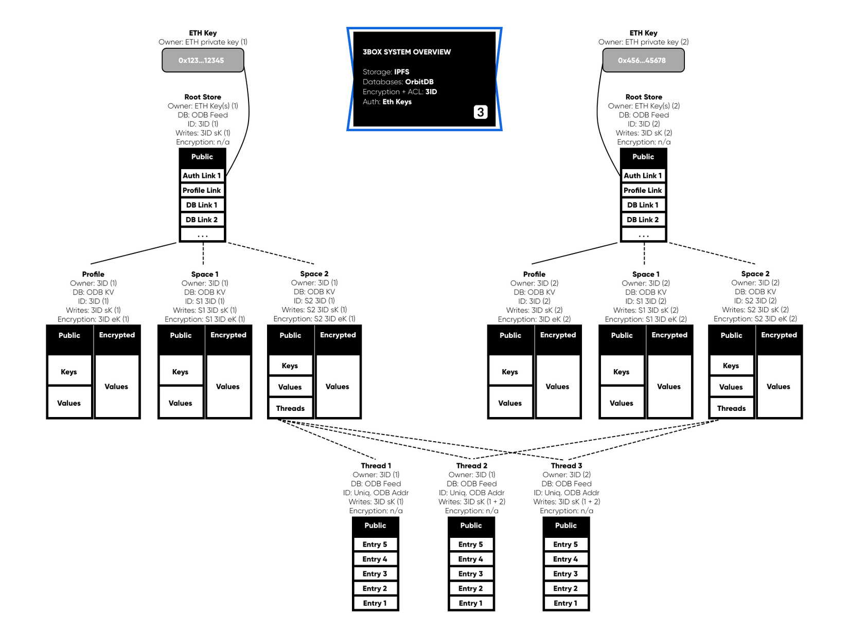 Cốt lõi của mỗi tài khoản 3Box là 3ID, số nhận dạng phi tập trung (DID), hoạt động như một định danh dữ liệu duy nhất và cho phép người dùng quản lý dữ liệu và thông tin của họ trên các cơ sở dữ liệu, tài khoản và mạng phi tập trung khác nhau.