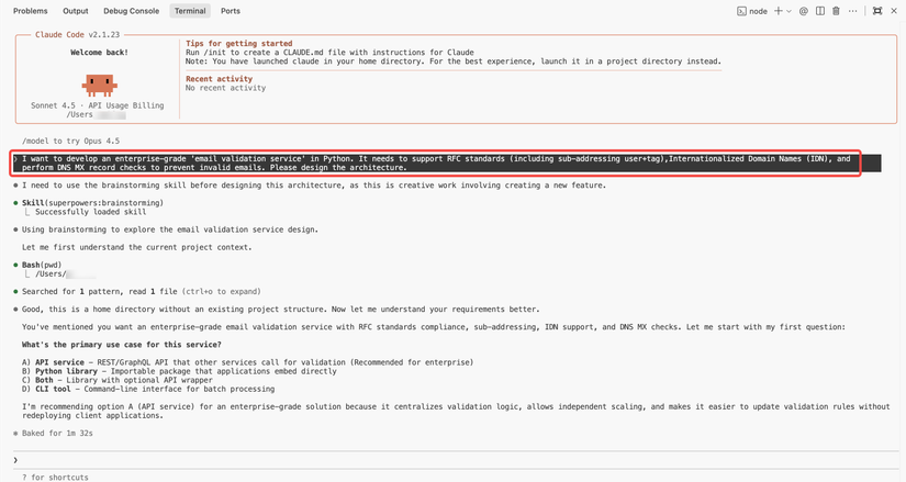 Khi đưa ra yêu cầu, Superpowers sẽ tự động kích hoạt /brainstorm. Nó không trả lời kiểu "Ok, tôi viết code ngay đây!" đâu.