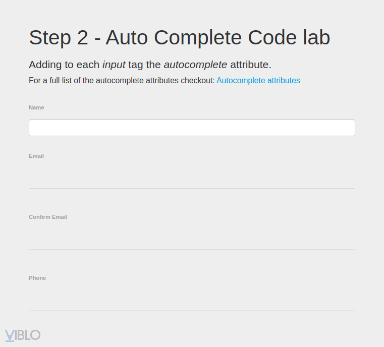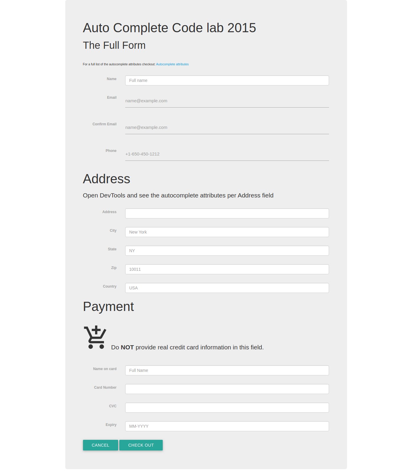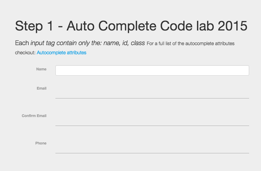 Ở những form cơ bản chúng ta sẽ thêm vào mỗi thẻ input thuộc tính autocomplete. Thuộc tính này sẽ thông báo cho trình duyệt biết loại data nào mà bạn mong muốn với thẻ input tương ứng. Ví dụ như email, fullname, phone, etc... Hãy thêm vào file index.html mà bạn đã thêm ở trên đoạn code sau: