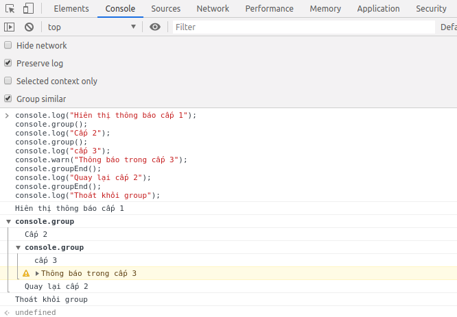 console.warn("Thông báo trong cấp 3");