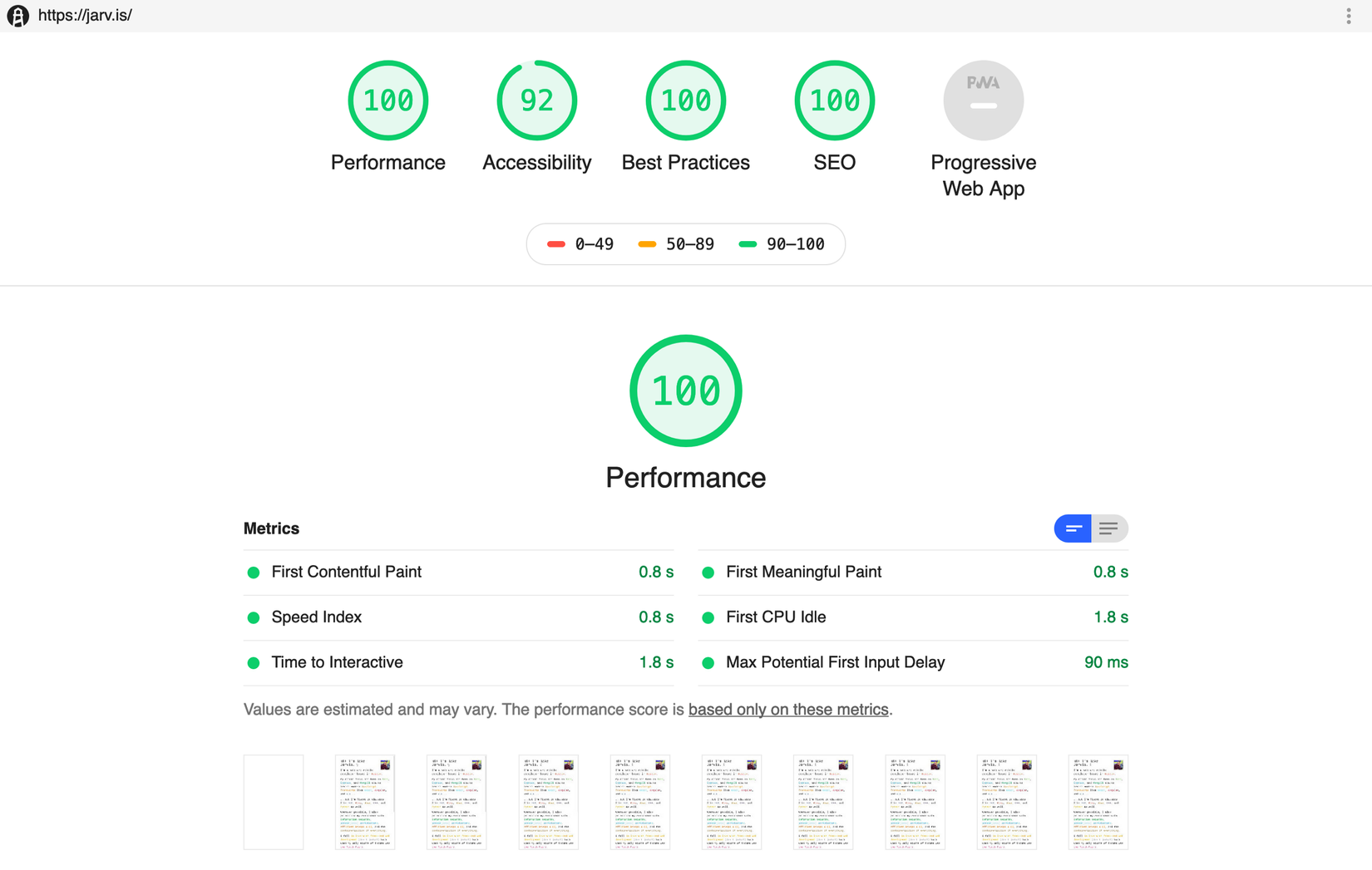 Quy trình công việc sau đây thực hiện kiểm tra Lighthouse trên jarv.is , hiển thị năm điểm số trong đầu ra của từng bước và tải lên kết quả dưới 2 dạng .html và .json giống như các bằng chứng để tải xuống (như được hiển thị ở trên).