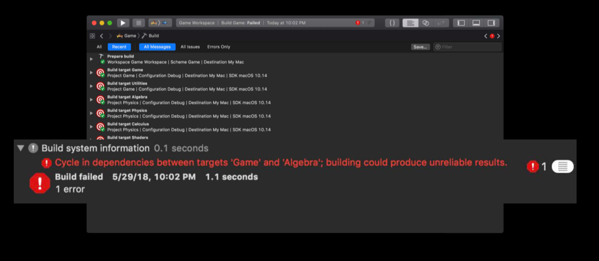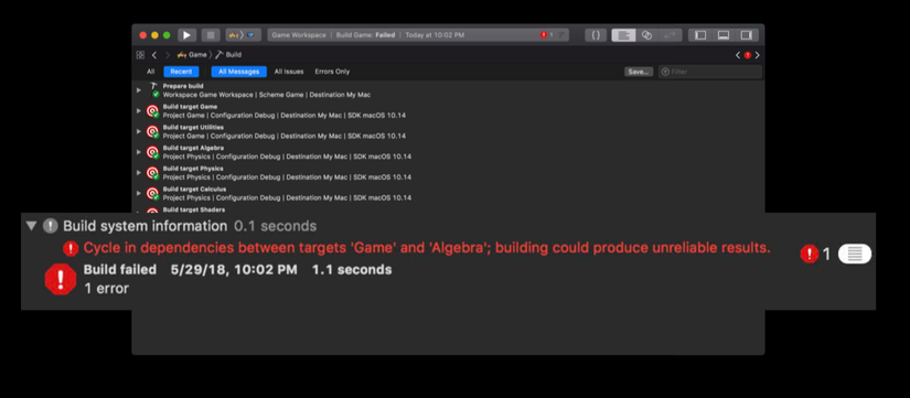 Xcode 10 cũng đã tốt hơn nhiều trong việc chuẩn đoán cycles dependency trong dự án bằng cách đưa ra các lỗi chi tiết trong build log . New guide cũng đã được xuất bản trực tuyến để tìm hiểu làm thế nào để sửa chữa và phát hiện một cycle .