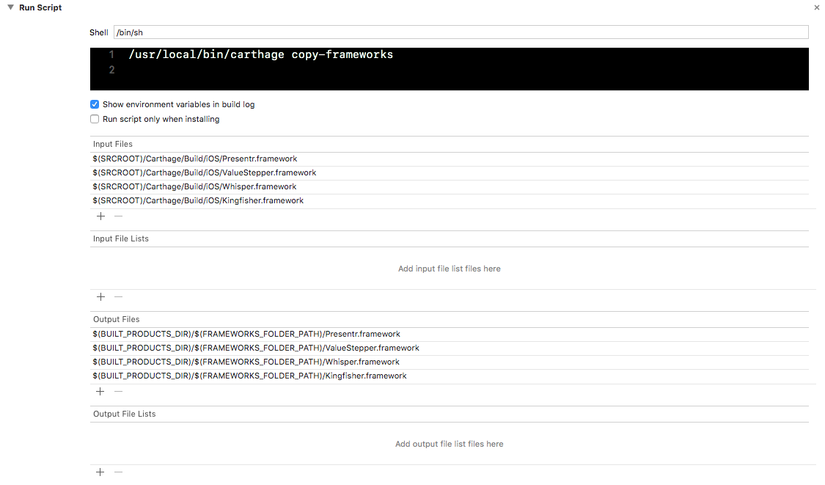 Như bạn có thể nhận thấy từ các ảnh chụp màn hình này , Xcode 10 có 1 tuỳ chọn mới để chỉ định danh sách file inputs và outputs . Trong trường hợp bạn có nhiều files để liệt kê , bạn có thể làm như vậy bằng cách tạo tệp .xcfilelist để và chỉ định tất cả các thư mục trong đó . Ví dụ , bạn có thể thiết lập một tập script tự động update một Carthage.xcfilelist mỗi khi bạn thêm một dependency mới để tránh quên thêm file inputs và outputs . Định dạng của file khá đơn giản :