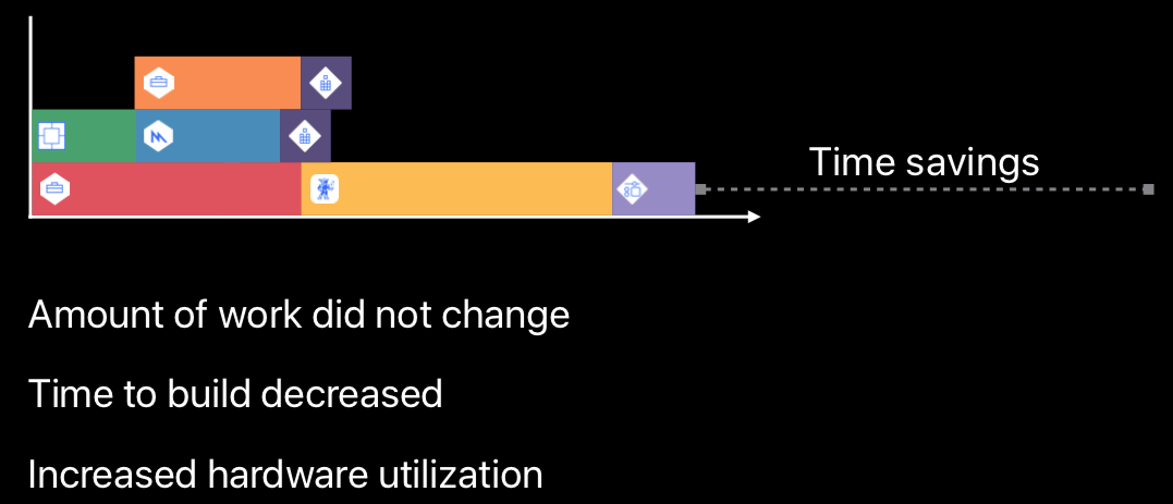 Xcode cố gắng tận dụng tốt hơn phần cứng có sẵn bằng cách phân bổ trên nhiều core ( lõi ) để build . Vì thế, timeline của nó được minh hoạ như sau :