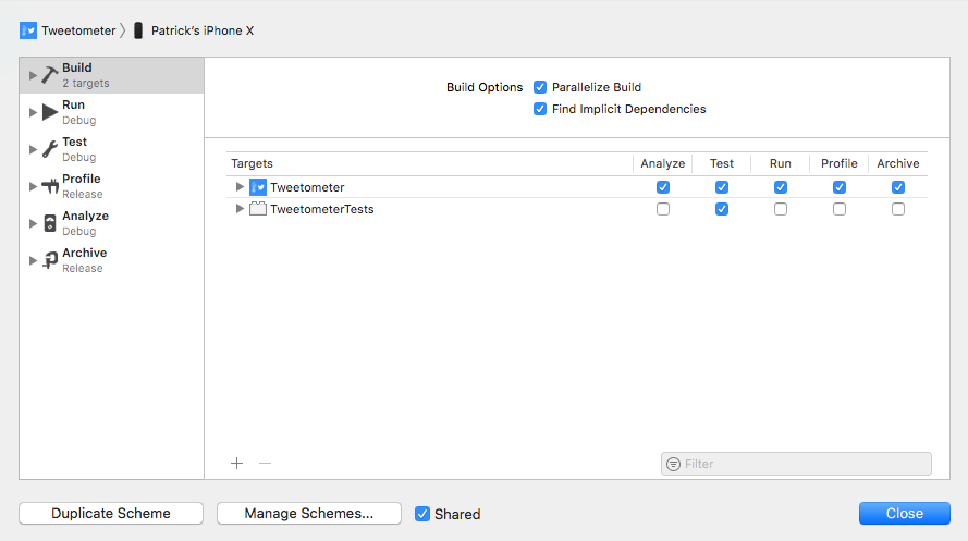 Khi mở app trên Xcode 10 , build song song nên được enabled . Để kiểm tra tuỳ chọn này , hãy mở scheme editor , chọn “Build“ , hãy đảm bảo rằng “Parallelize Build” đã được tích xanh như dưới đây :