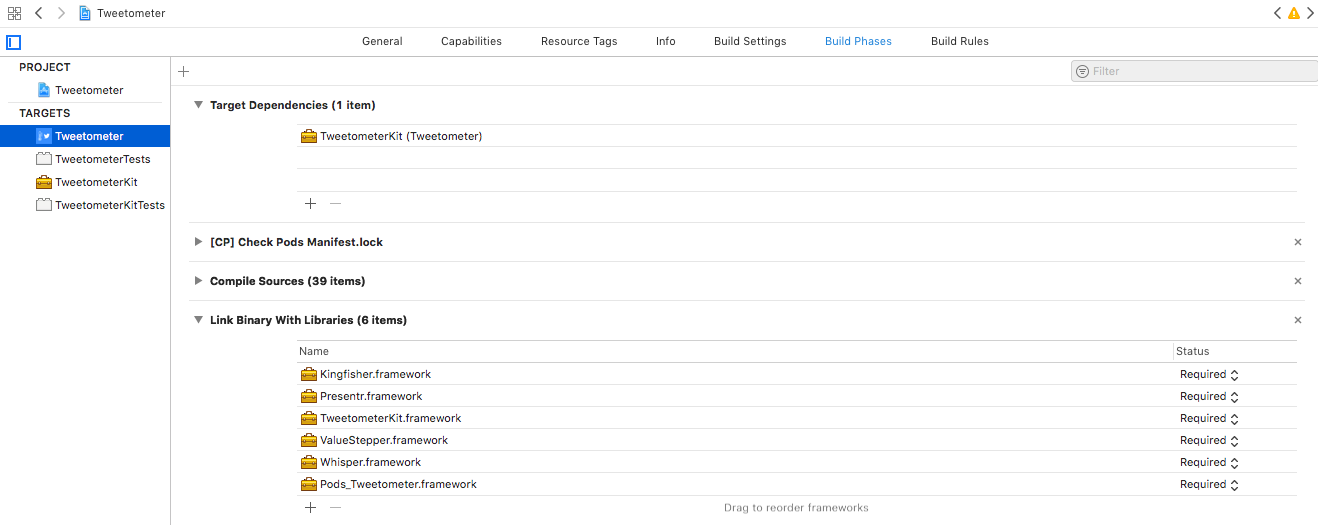 Bạn có thể xem các dependencies của một target trực tiếp trong “Build Phases” . Hãy nhìn vào một ví dụ mà tôi đã làm gần đây , Tweetometer .
