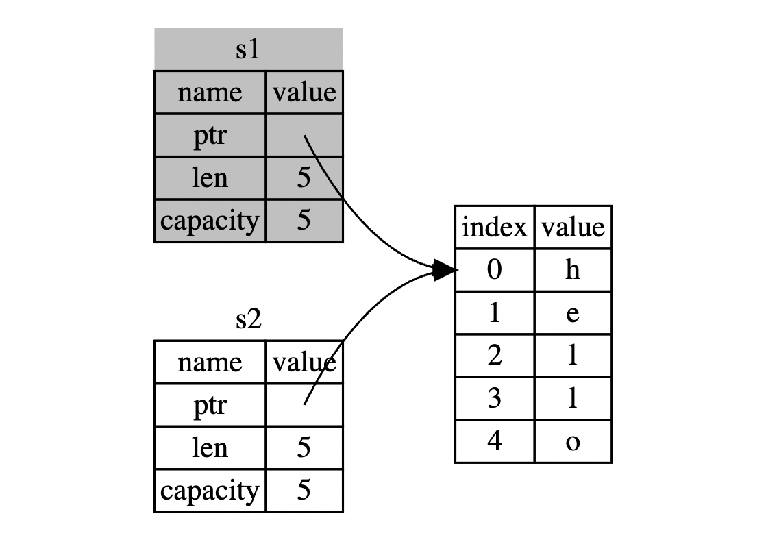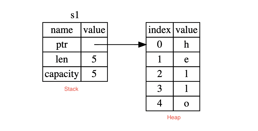 s1 là một bộ data được lưu trên Stack bao gồm ptr, len, capacity, ptr trỏ đến giá trị thật sự là "hello" đang được lưu trên Heap, bộ data này biểu thị viêc s1 đang là owner của giá trị "hello" .
