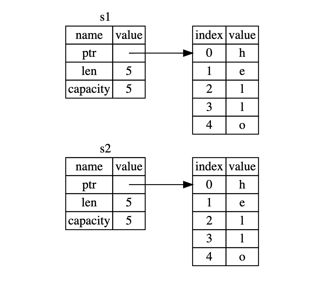 Lúc này s1, s2 là 2 owner của 2 giá trị hoàn toàn nằm riêng rẽ nhau trên Heap, cho nên s1 vẫn hợp lệ sau khi thực hiện phép let s2 = s1.clone()