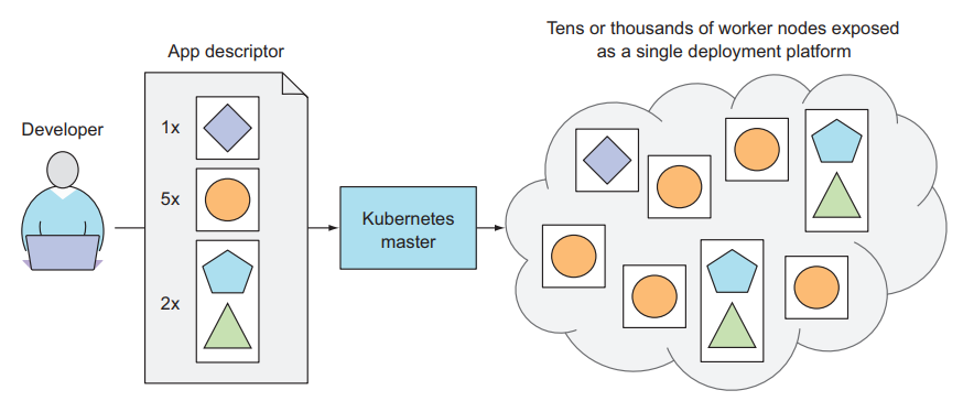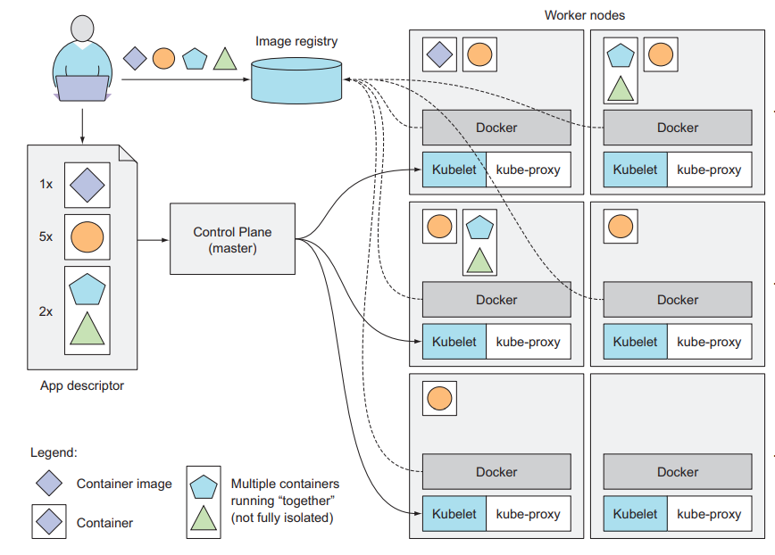 Chúng ta xem hình bên dưới để hiểu rõ hơn về cách các ứng dụng được triển khai trên Kubernetes. Phần app descriptor liệt kê 4 container, được gom thành 3 nhóm. Hai nhóm đầu tiên chỉ chứa một container, trong khi nhóm cuối cùng chứa hai. Điều đó có nghĩa là cả hai container này cần chạy cùng nhau. Bên cạnh mỗi nhóm, chúng ta cũng thấy thông tin về số lượng các bản sao của mỗi nhóm cần được deploy. Sau khi submit descriptor đến Kubernetes, thành phần Schedule của master node sẽ chỉ định vị trí của từng nhóm tại các nút worker có sẵn. Kubelets trên các worker node sau đó sẽ yêu cầu Docker kéo image container Docker hub và chạy các container lên.