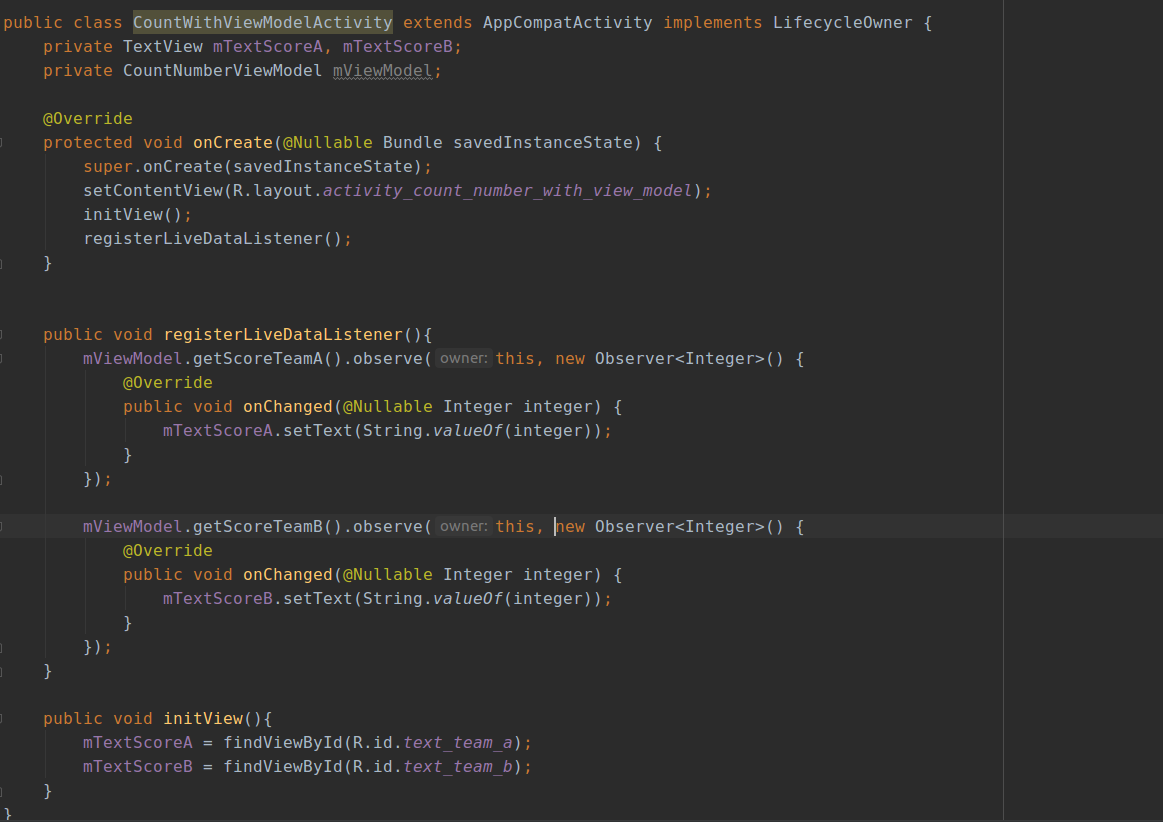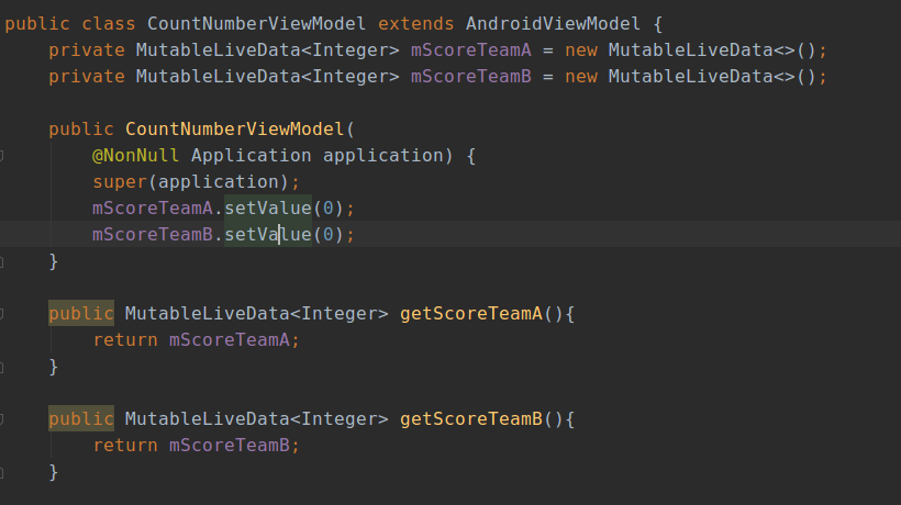 Trong ví dụ trên mình khai báo đối tượng LiveData với kiểu Integer ( mScoreTeamA và mScoreTeamB) và để truy cập vào chúng mình sử dụng method getScoreTeamA() và getScoreTeamB()