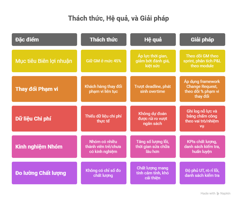| Khách hàng thay đổi scope liên tục | Trượt deadline, phát sinh overtime | Áp dụng framework Change Request, tracking % scope creep |