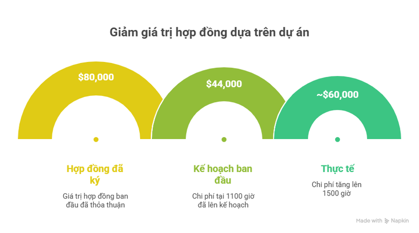 - Thực tế: Scope tăng 35% → effort vọt lên 1,500 giờ (~$60,000) → GM thực tế giảm còn ~25%