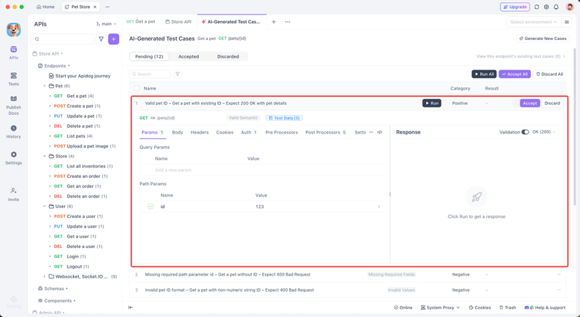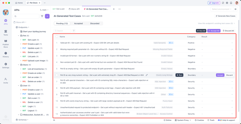 Sau khi tạo xong, các test case sẽ hiện ra thành danh sách. Kiểm tra từng cái, những cái dùng được thì chọn "Accept", những cái không chắc thì chọn "Delete". Chỉ giữ lại những cái ưng ý rồi lưu là xong. Bạn cũng có thể export test report để chia sẻ với team.