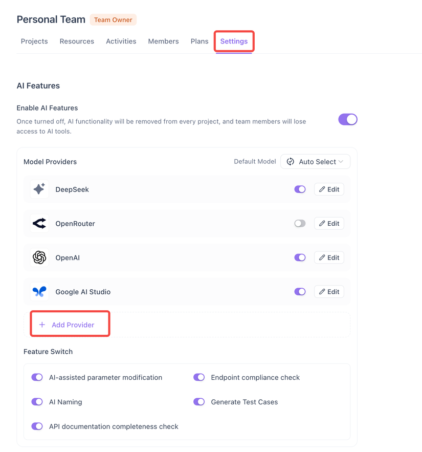Apidog không cung cấp AI model riêng. Vì vậy bạn cần tự chuẩn bị API key từ các dịch vụ AI bên ngoài như OpenAI hay Claude và cài đặt.