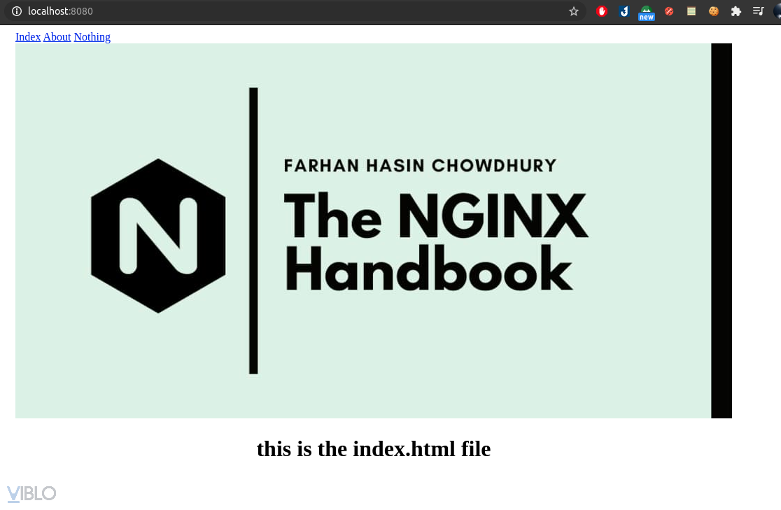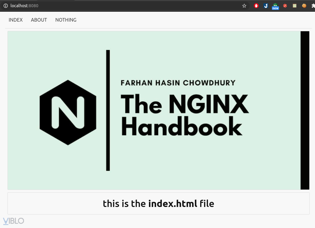 Khi cấu hình như vậy, khi có một request gửi tới, Nginx sẽ tìm kiếm file index.html ở trong thư mục /var/www/html/nginx-handbook-projects/static-demo, và trả về cho client. Dùng trình duyệt và truy cập vào localhost:8080, kết quả như sau: