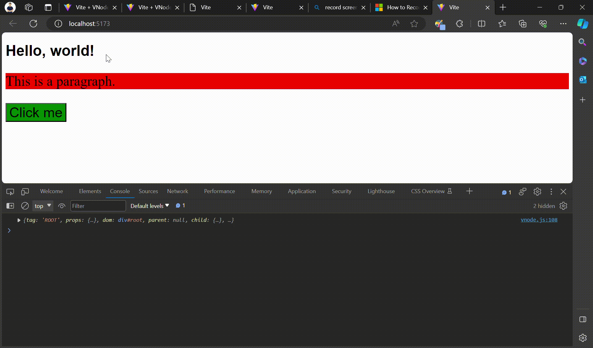 src/App.js chỗ này sử dụng object thay thế jsx do nếu muốn sử dụng jsx thì chúng ta cần phải viết plugin(vite or webpack) cho virtual dom mới tạo để parse từ code jsx sang cấu trúc hợp lệ với virtual DOM mới của chúng ta nên mình sẽ gợi ý một số thứ cần để mọi người tham khảo và thực hiện trong tương lai: JSX Babel parser, AST hoặc mình sẽ tiếp tục phần này trong tương lai 😇 còn tạm thời thì cứ như dưới đã.