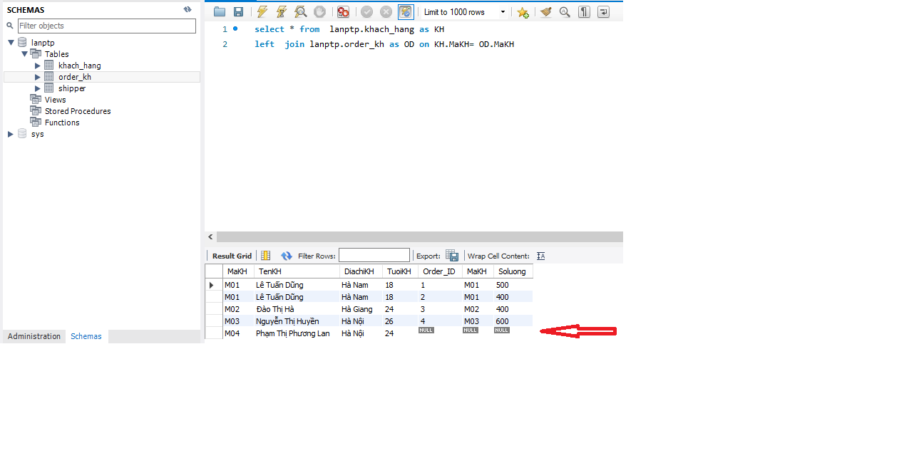 Ví dụ: Vẫn với data như 2 bảng ở trên khach_hang, order_kh khi sử dụng câu lệnh Left Join kết quả sẽ trả ra như sau: