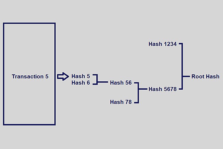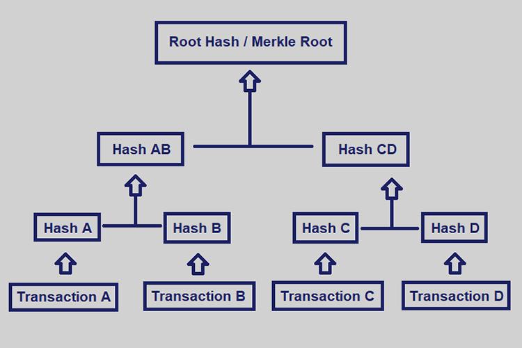 Hãy xem xét một ví dụ về bốn giao dịch trong một khối: A, B, C và D. Mỗi giao dịch được băm và hàm băm được lưu trữ trong mỗi nút lá, dẫn đến các cặp Hash A, B, C và D. Liên tiếp các nút lá sau đó được tóm tắt trong một nút cha bằng cách băm Hash A và Hash B, dẫn đến Hash AB và băm riêng Hash C và Hash D, dẫn đến Hash CD. Hai băm (Hash AB và Hash CD) sau đó được băm lại để tạo Root Hash (Root Merkle).