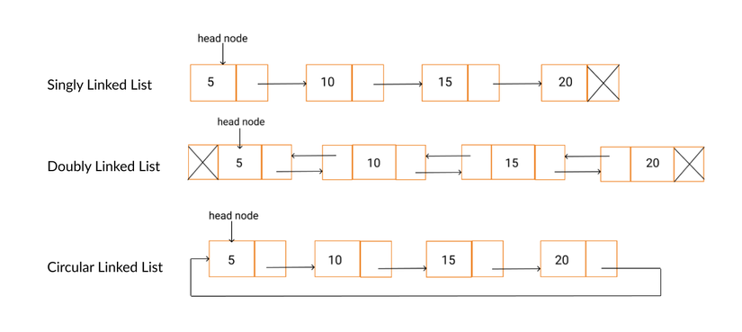 Linked list về cơ bản sẽ để cho các phần tử lưu vị trí của phần tử tiếp theo (hoặc có thêm phần tử trước đó). Có vài loại linked list là Singly (chỉ lưu ref tới phần tử kế tiếp) hay Doubly (lưu cả phần tử trước và sau) và Circurlar (nối đuôi).