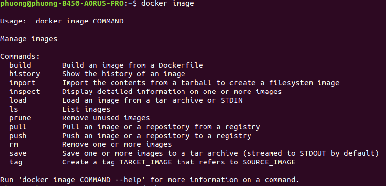 Tất cả những câu lệnh chúng ta thao tác với Docker Image đã hiện ra việc của chúng ta là thử từng câu lệnh xem chức năng của nó là gì nhỉ. Chú ý khi bạn muốn trợ giúp câu lệnh nào thì các bạn gõ lệnh docker và thêm --help vào cuối câu lệnh nhé, sẽ show ra trợ giúp chúng ta.