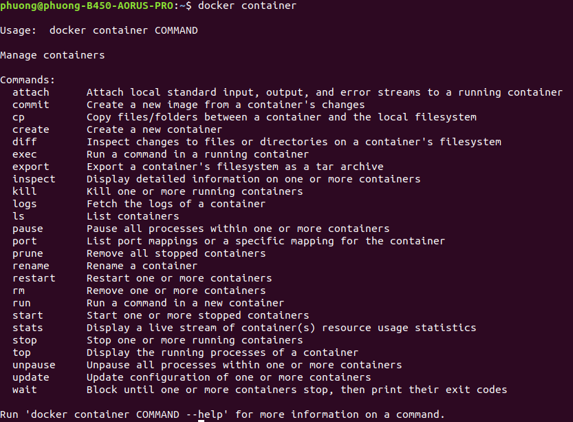Cũng tương tự như docker image tất cả những câu lệnh chúng ta thao tác với Docker Container đã hiện ra việc của chúng ta là thử từng câu lệnh xem chức năng của nó là gì nhỉ. Chú ý khi bạn muốn trợ giúp câu lệnh nào thì các bạn gõ lệnh docker và thêm --help vào cuối câu lệnh nhé, sẽ show ra trợ giúp chúng ta.