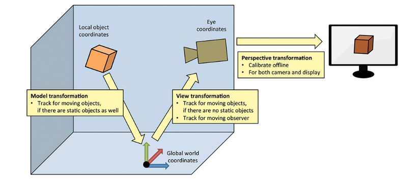 Trong hình trên, AR cần xem xét nhiều hệ thống biến đổi. Chuyển đổi mô hình mô tả tư thế của các đối tượng chuyển động trong một môi trường tĩnh. Chuyển đổi chế độ xem mô tả tư thế của máy ảnh, cảm biến theo dõi hoặc hiển thị trong môi trường. Chuyển đổi phối cảnh mô tả ánh xạ từ tọa độ mắt sang tọa độ màn hình. Cả hai biến đổi mô hình và khung nhìn đều có thể được tracking, và register.