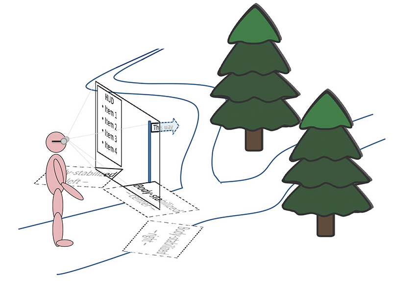 Ảnh dưới là một ví dụ minh họa : Giả sử rằng người trong ảnh đang sử dụng hệ thống điều hướng mà anh ta trải nghiệm qua kính AR. Giao diện AR giúp anh ta thông báo về điểm đến của mình, cho biết lộ trình của anh ta dọc theo tuyến đường đã chọn và giúp anh ta đưa ra quyết định rẽ chính xác hơn. Chiếc kính cho anh ta nhìn thấy các chú thích của thế giới trước mặt anh ta, chẳng hạn như biển chỉ dẫn màu xanh (ảo), cho biết anh ta lên rẽ bên nào.