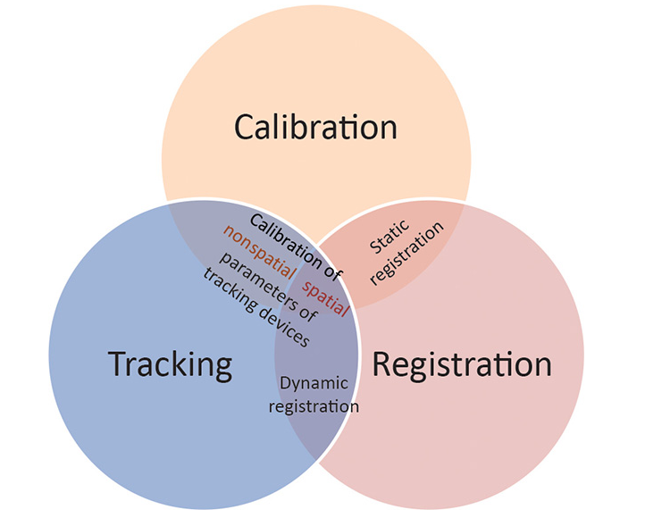 Trong context của AR, ba thuật ngữ quan trọng được liên kết với việc đo lường và căn chỉnh các đối tượng là tracking, calibration, resgistration.