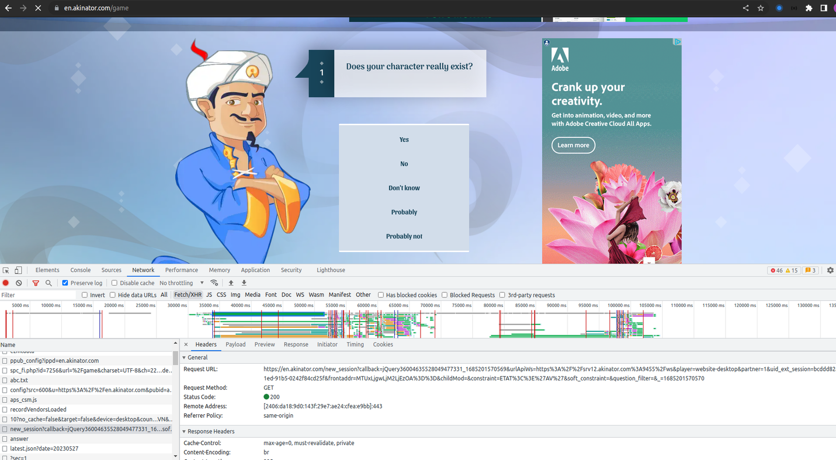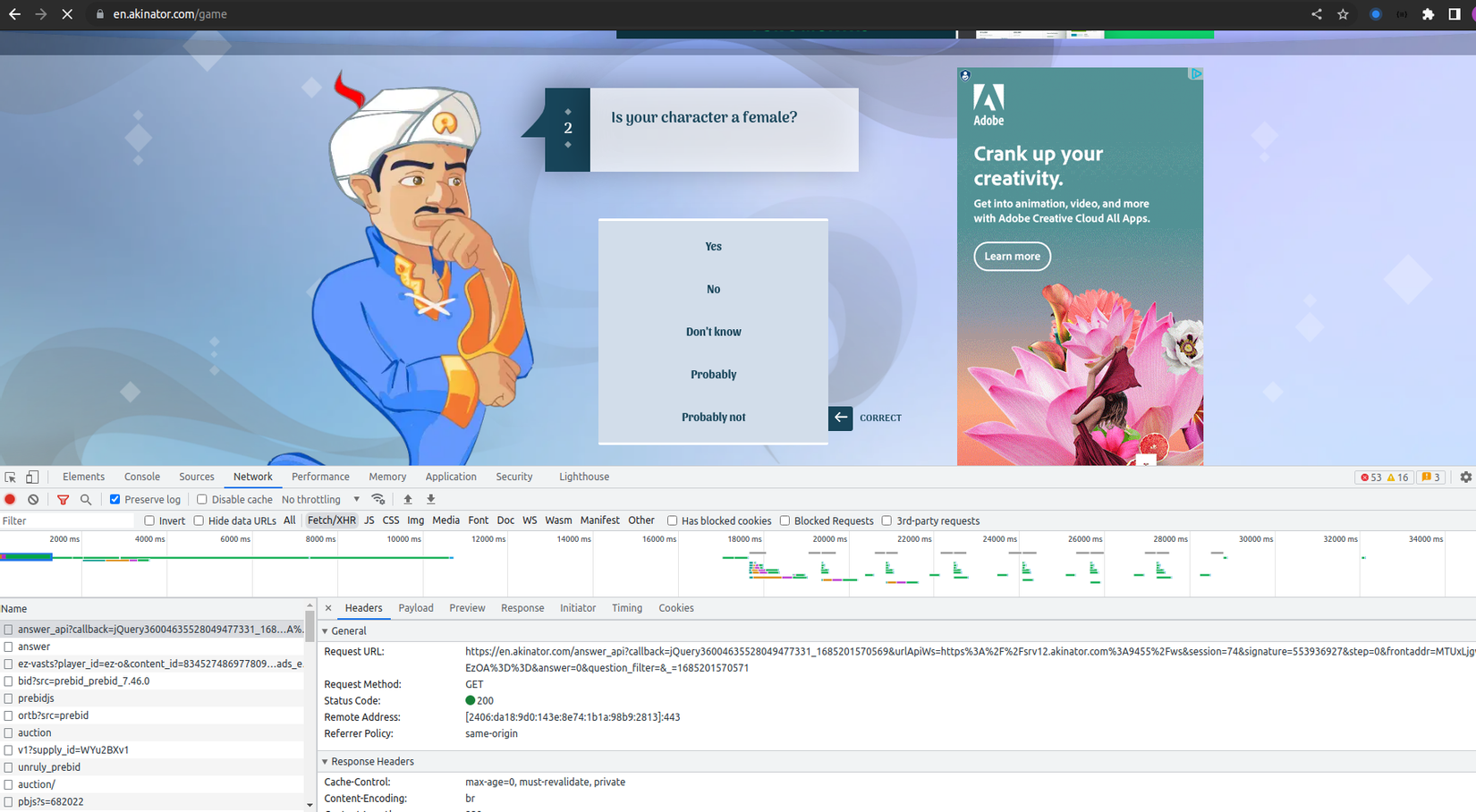 Đầu tiên, mình vào trang https://en.akinator.com và dùng ứng dụng, sau đó inspect trang web xem khi chạy nó call những API nào để mình sử dụng lại API đó. Và cũng tìm ra 2 API chính:
