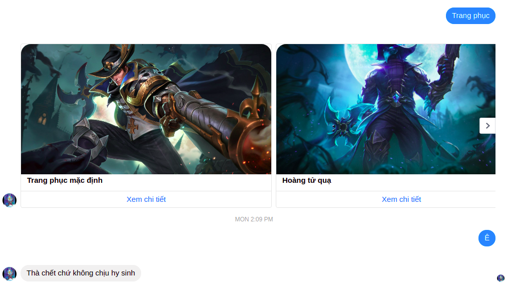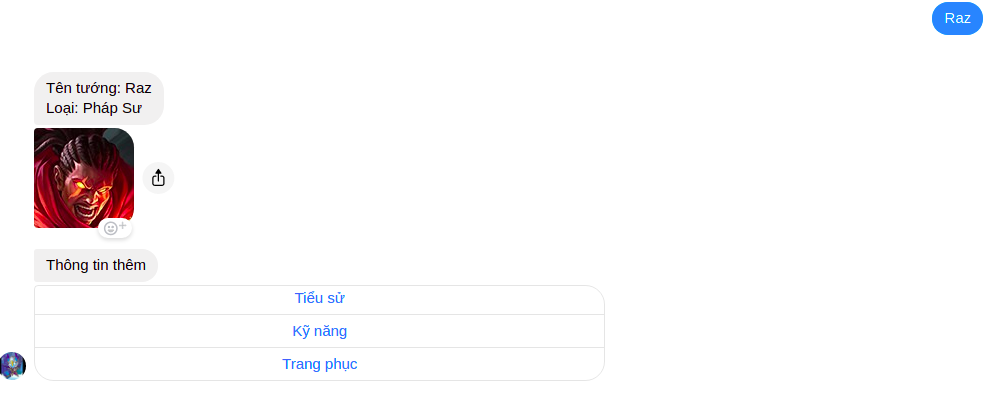 Nếu tìm thấy tướng, câu trả lời sẽ trả về tên tướng, ảnh tướng, và các postback cho các chức năng: Tiểu sử, Kỹ năng, Trang phục