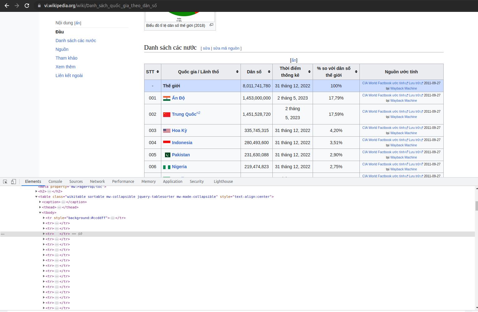 Như ảnh trên, ta thấy mỗi quốc gia được đặt trong thẻ tr trong table có class là wikitable. Nên ta có đoạn code dưới đây để lấy ra list các quốc gia: