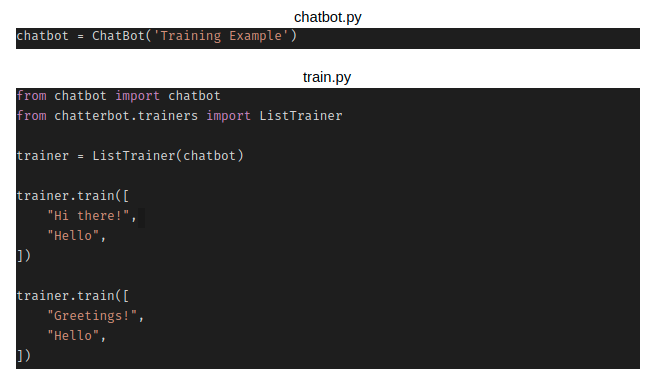 Đối với quá trình training này, bạn sẽ cần đưa vào một list các statement, trong đó thứ tự của mỗi statement được dựa trên vị trí của nó trong cuộc hội thoại. Ví dụ, nếu bạn chạy bot dưới đây sau khi train, thì kết quả trả về khi chat bot nhận hai statement “Hi there!” và “Greetings!” là “Hello”.