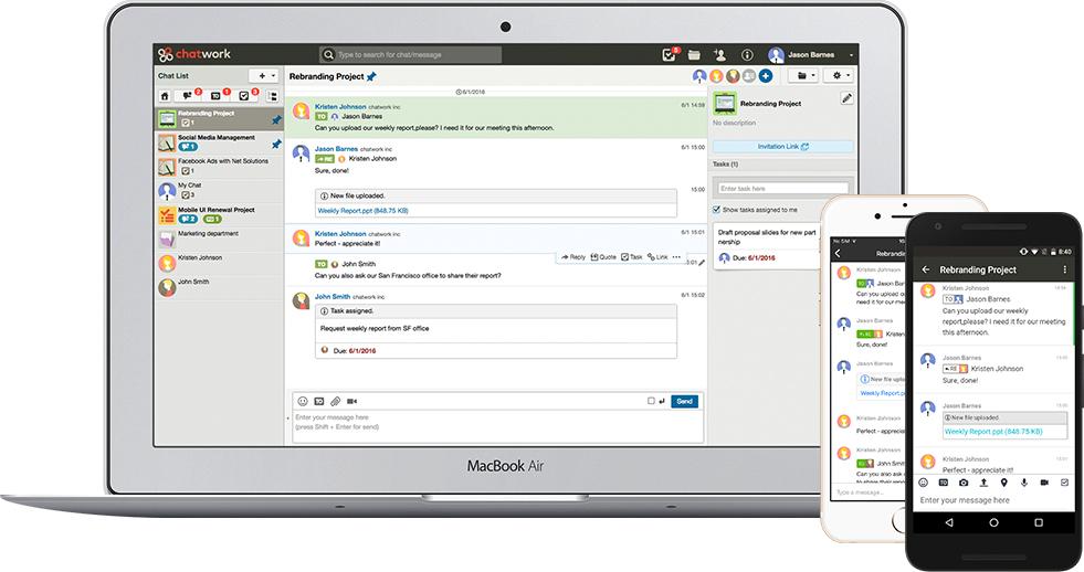 "Chatwork là một nền tảng tích hợp tất cả trong một: tính năng chat, chỉ định công việc, gọi thoại/video và chia sẻ tập tin. Chatwork giúp nhân viên dễ dàng làm việc theo nhóm bằng hình thức đối thoại trực tiếp, tăng khả năng tương tác và nâng cao hiệu quả công việc" - Giới thiệu từ trang chủ chatwork