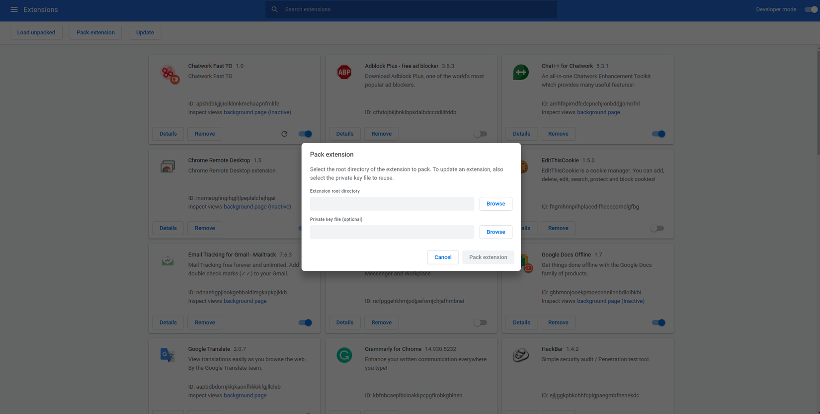 Chọn Pack extension > Chọn đường dẫn đến thư mục root project ở Extension root directory > Nhấn Pack extension. OK có ngay 1 file chatwork-fast-to.crx để gửi cho con tấm con cám dùng thử rồi