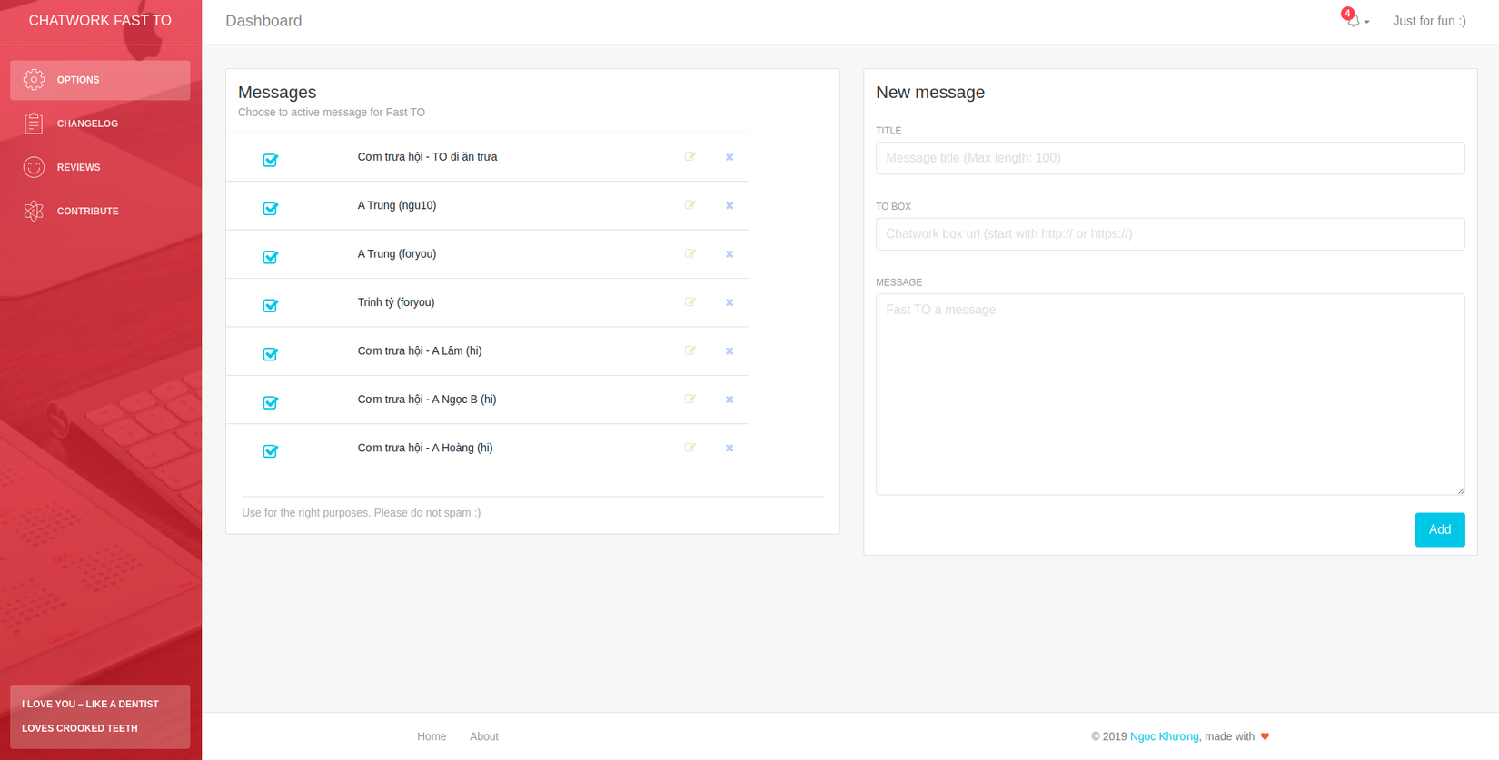 Nếu có thời gian rảnh, có thể cùng mình contribute cho project này: https://github.com/lamngockhuong/chatwork-fast-to