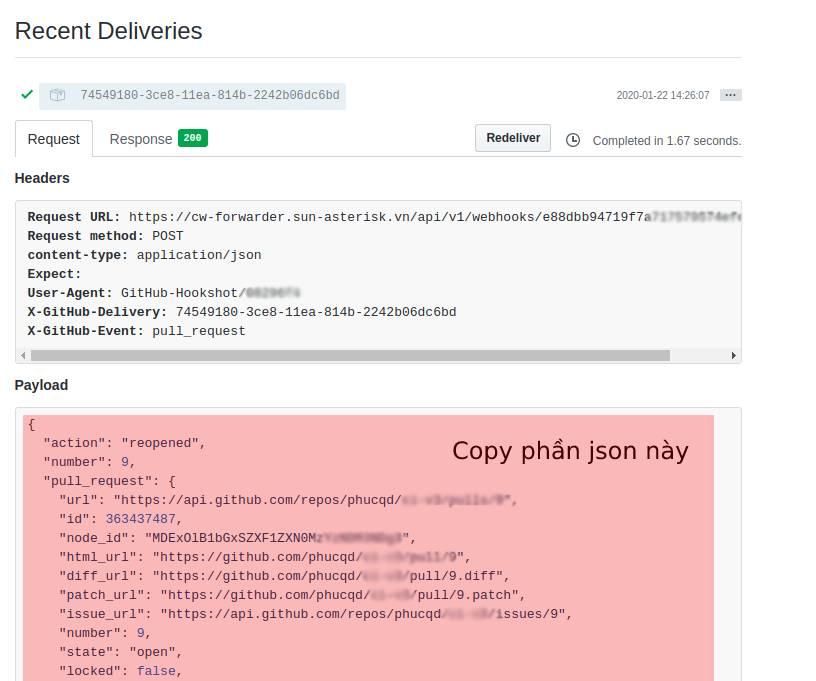 Với Github để có payload params mẫu, chúng ta lại vào phần setting webhook, tại phần Recent Deliveries tùy vào từng event mà github sẽ trả về những payload khác nhau, ở đây của chúng ta là event Pull Request.