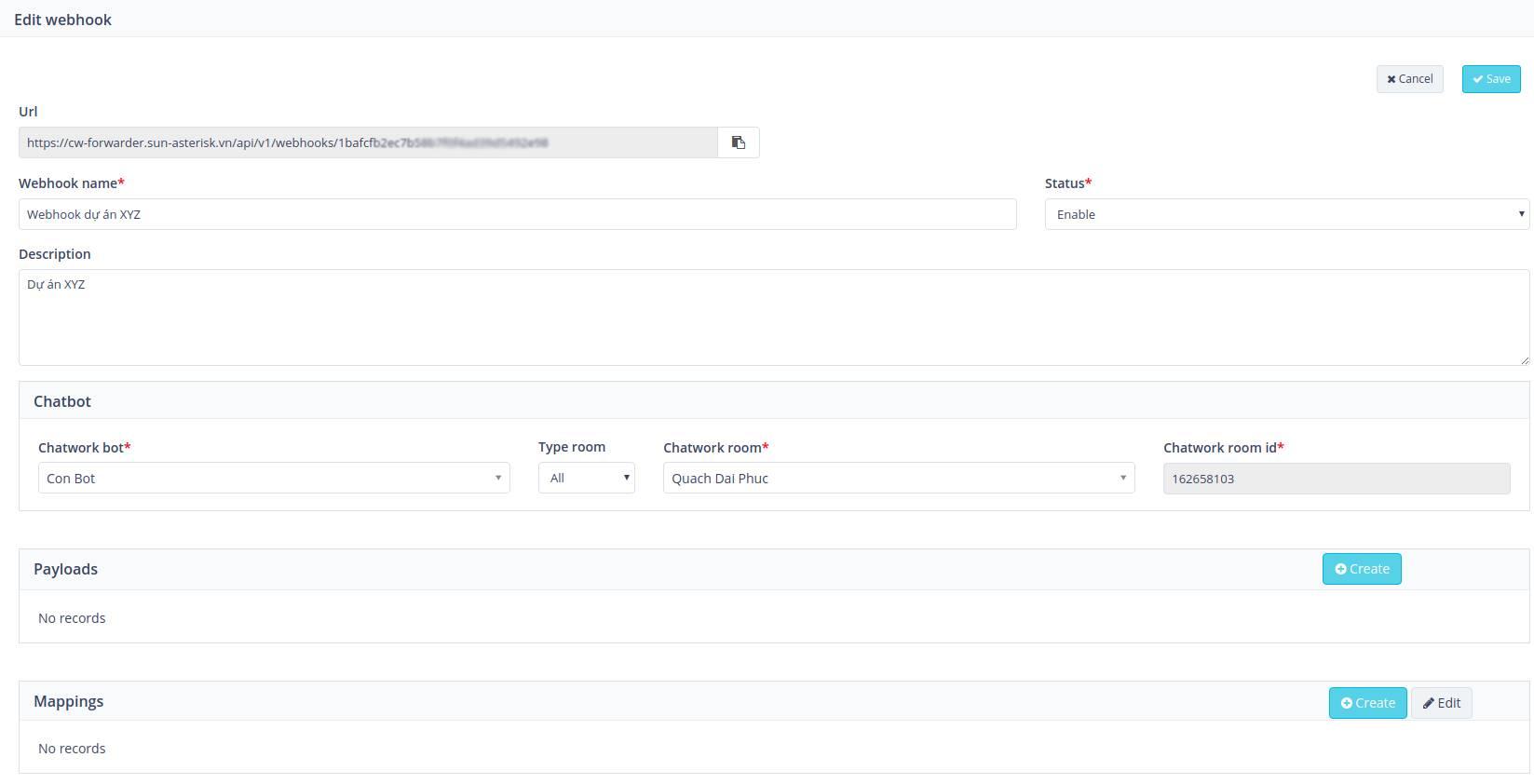 Sau khi save, lập tức chúng ta sẽ qua màn hình edit webhook, ở đây là nơi cho phép config các thành phần quan trọng như payload sẽ nhận, các điều kiện để message được gửi đi khi payload thỏa mãn và convert dữ liệu nếu cần ở mục mapping